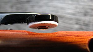 Shown here is a close up of a typical Bb key with a recess to allow for easy "roll-on" action with the Thumb. The second picture is a closeup of the white-leather pad with installed metal resonator on a C-Natural key. Both keys are Black Nickel plated, the timber is Satiné.