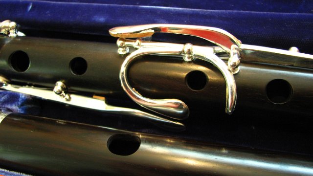 Close up the the middle section of the flute in it's case with the head in the front, with Long F-Natural, G-Sharp, B-Flat lever and C-Natural