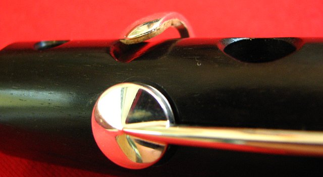Close up of Short F-Natural Key with it's touchpiece recess in the timber of the mainbody, Long F-Natural key and notehole in front of it